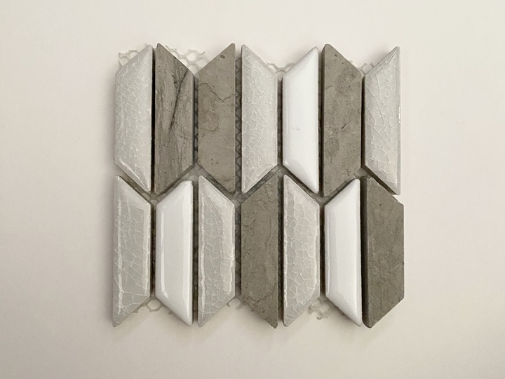 同じく平田タイルの「フレッチャ(Freccia)」。ツヤのあるタイルと石タイルがミックスされた表情豊かなタイルです。こちらは熱海のキャビネットに色違いを施工したことがありました。