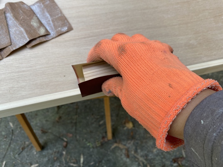 屋外に天板を運び出してやすりがけ作業をおこないました。